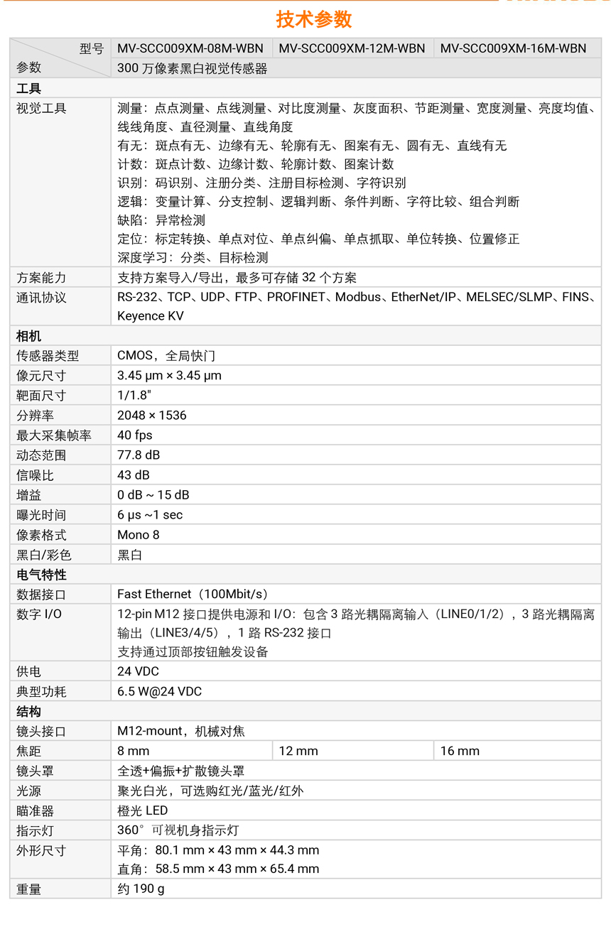 海康威視MV-SCC009XM 視覺傳感器內部植入高精度高效率視覺算法,可實現計數、有無、測量、識別等功能。可通過 SCMVS 進行監視和操作,通過RS-232、以太網輸出工具結果,通過 IO 與上下游工序配合。支持視覺工具多種結果輸出以及自定義結果文本輸出。