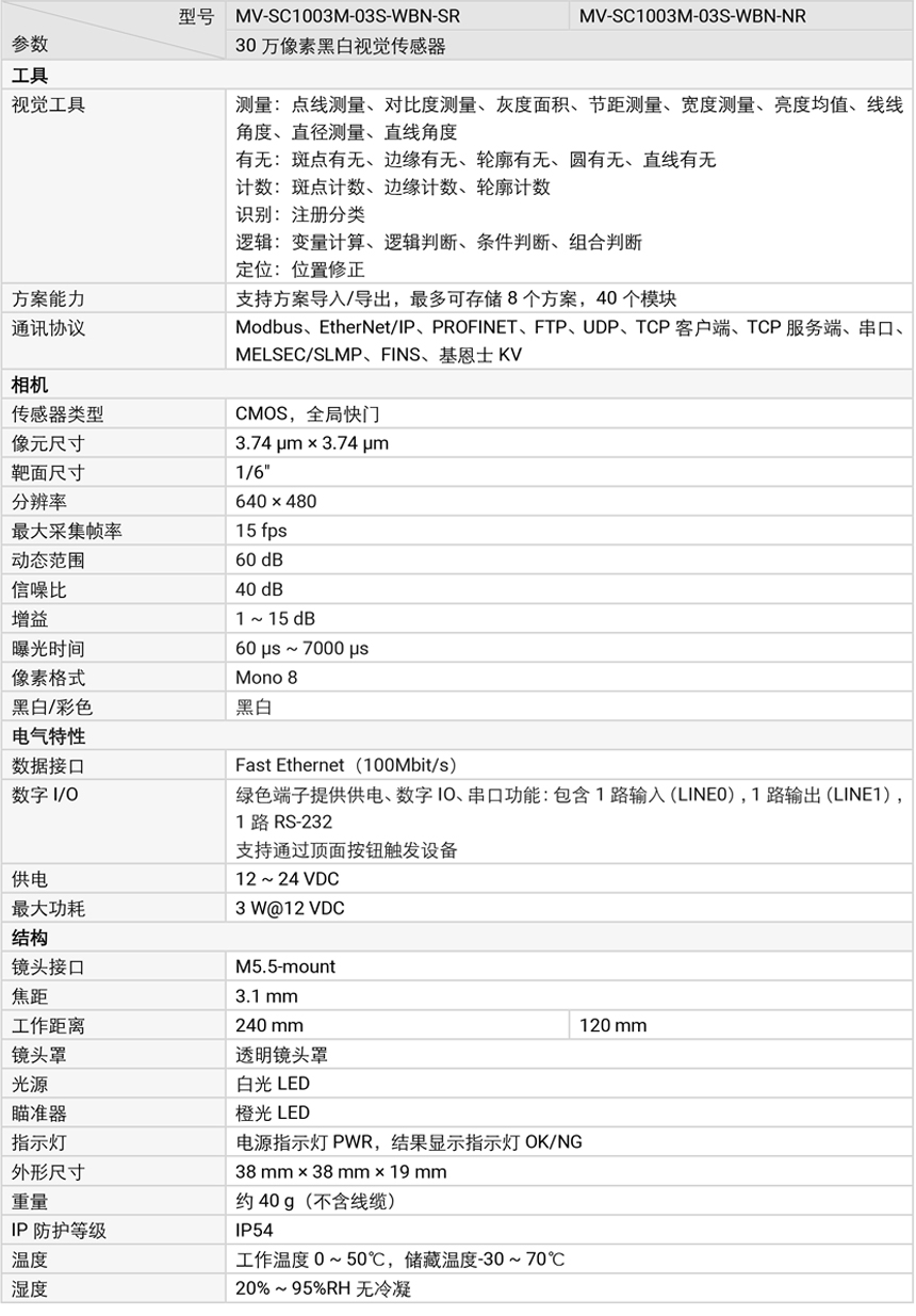 海康威視MV-SC1003M 視覺傳感器內部植入高精度定位與測量算法,可實現計數、有無、測量等功能。可通過 SCMVS 進行監視和操作,通過 RS232、以太網輸出工具結果,通過 IO 與上下游工序配合。支持視覺工具多種結果輸出以及自定義結果文本輸出。