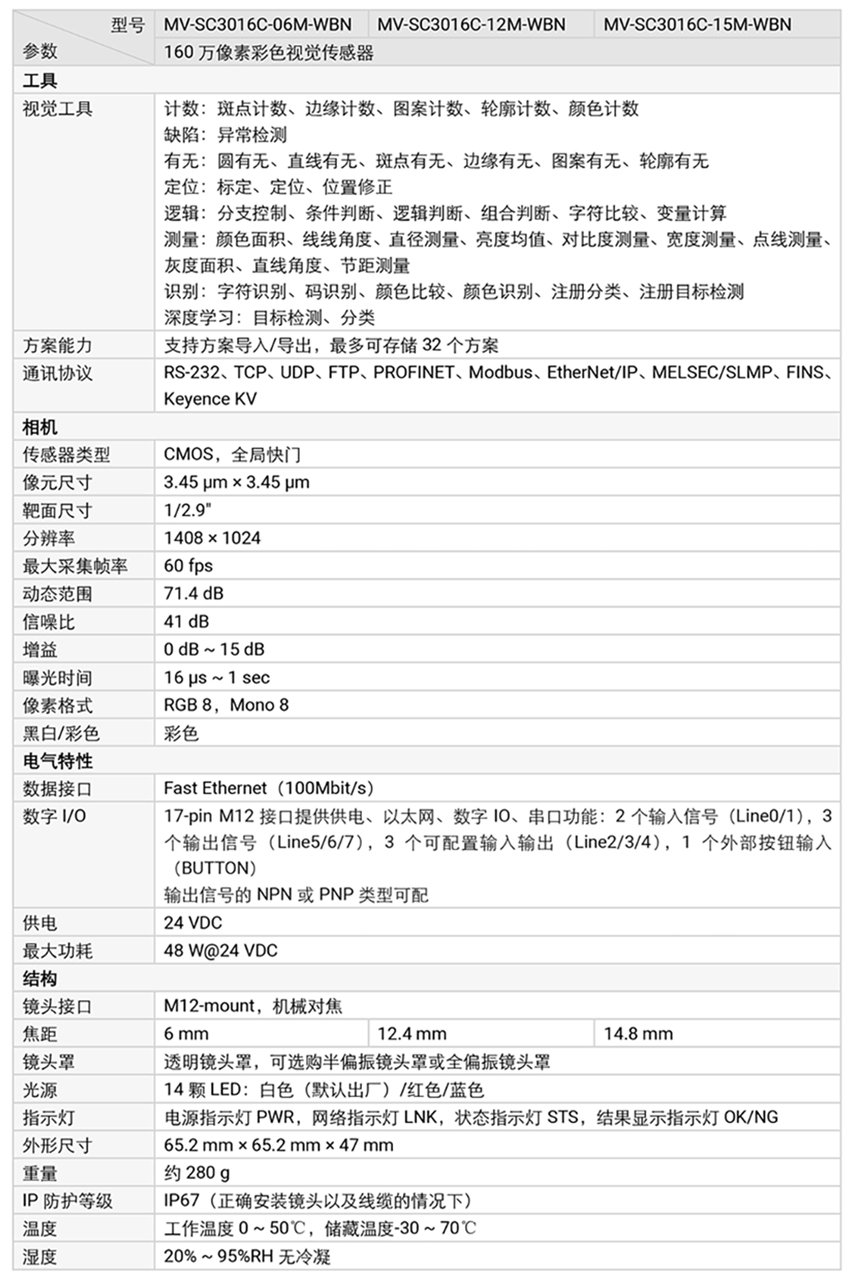 海康威視MV-SC3016C 視覺傳感器內部植入高精度高效率視覺算法,可實現計數、有無、測量、識別等功能。可通過 SCMVS 進行監視和操作,通過RS-232、以太網輸出工具結果,通過 IO 與上下游工序配合。支持視覺工具多種結果輸出以及自定義結果文本輸出。
